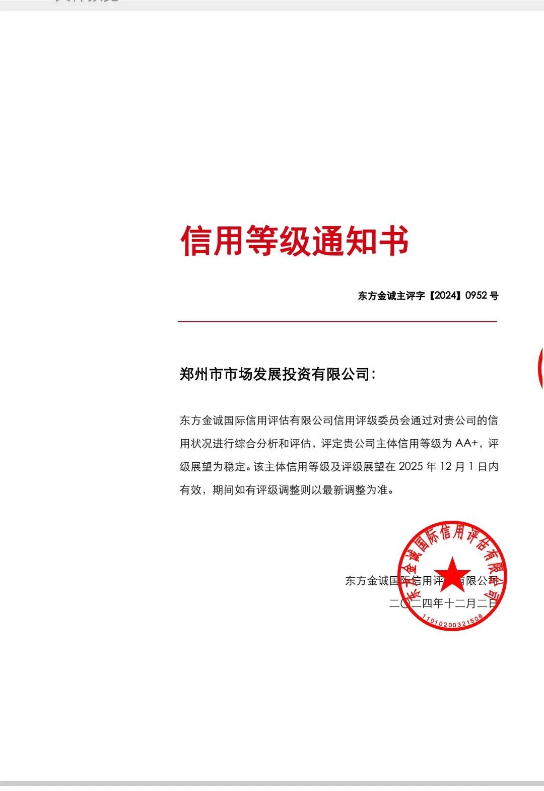 近日,鄭州市市場發(fā)展投資有限公司獲得國內(nèi)權(quán)威評級機(jī)構(gòu)東方金誠國際信用評估有限公司AA+主體信用評級,評級展望為“穩(wěn)定”。