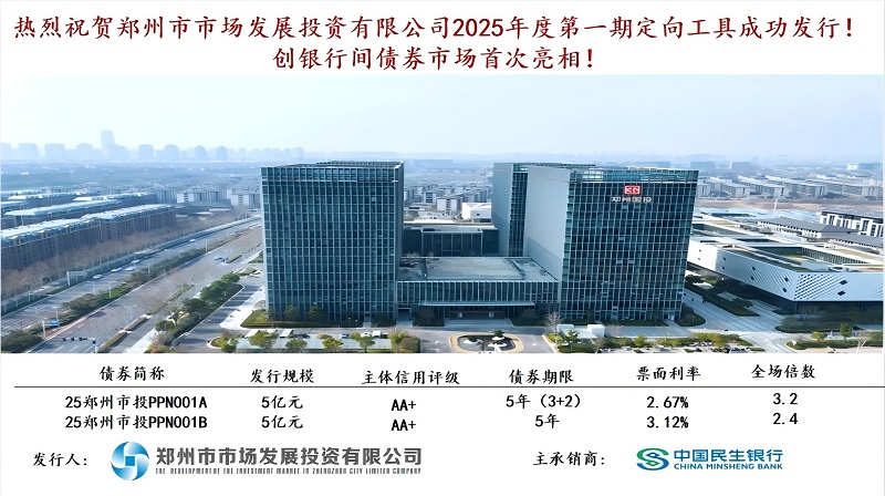 近日,鄭州市市場(chǎng)發(fā)展投資有限公司(以下簡(jiǎn)稱“鄭州市投”,外部主體評(píng)級(jí)AA+)成功發(fā)行2025年度第一期定向債務(wù)融資工具,進(jìn)一步優(yōu)化了公司融資結(jié)構(gòu)。本期債券由民生銀行擔(dān)任主承銷商,發(fā)行總規(guī)模10億元,創(chuàng)新采用“3+2年”(票面利率2.67%)與“5年”(票面利率3.12%)雙期限結(jié)構(gòu),創(chuàng)下近期同期限、同評(píng)級(jí)企業(yè)信用債首發(fā)利率較低水平,顯示出資本市場(chǎng)對(duì)鄭州國(guó)企發(fā)展前景的高度認(rèn)可。